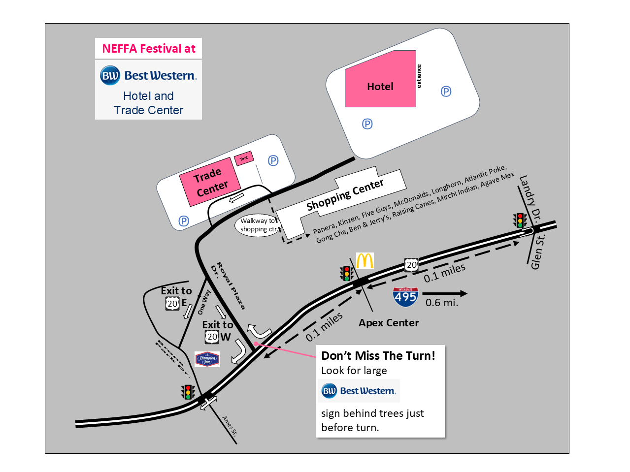 Follow I-495 to US-20 W/Lakeside Ave in Marlborough. Take exit 63B from I-495. Follow US-20 west for .8 miles, turn right onto Royal Plaza Drive, and continue less than half a mile to the Trade Center and Hotel.